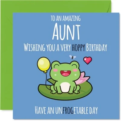MAKE YOUR AUNT SMILE WITH THIS UNIQUE BIRTHDAY CARD: This exceptional quality Aunt birthday card shows the design 'To an amazing Aunt Wishing you a very hoppy birthday. Have an unfrogetable day'. If you are looking for a beautiful birthday card Aunt, then then this happy birthday Aunt card is bound to make them smile. Not just a birthday card for Aunt this could also be a birthday gifts for Aunt, Aunty or Auntie. WHAT DO YOU GET: The card is printed on one side and BLANK ON THE INSIDE to allow you to write your very own message. The unique fun design is printed on a specially sourced and environmentally responsible board. At 360 microns thick the natural white one-sided gloss board has a quality look and feel. Supplied with a coloured gummed envelope to complement the design and ready to be sealed and sent in the post. Aunt Mothers Day cards, Aunty birthday cards, Auntie birthday card. NO INK SMUDGES: There is nothing worse than writing inside a card to find that the shiny surface makes the ink smudge. This is why we use a high quality one sided coated board. The uncoated side will absorb more of the ink from your pen to make smudging a thing of the past. Aunt birthday cards, Aunt birthday cards from Nephew. SIZES: Greeting Card = 145mm x 145mm, Envelope = 155mm x 155mm, Card Thickness = 360 micron. Happy birthday Aunt, Aunts birthday card, Aunt cards birthday, birthday card Aunt, happy birthday Aunt card, Aunt gifts from Nephew. MADE AND QUALITY CHECKED IN THE UK: We print and manufacture all our products right here in the UK so you can be sure of a fast turnaround and a product that is expertly made. Using environmentally responsible premium board our card is conscious of the responsible management of the world's forests - happy birthday card Aunt, Aunt birthday cards.