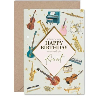 MAKE YOUR AUNT SMILE WITH THIS UNIQUE BIRTHDAY CARD: This exceptional quality Aunt birthday card shows the design 'Wishing a very Happy Birthday to a wonderful Aunt'. If you are looking for an awesome birthday card for Aunt, then then this happy birthday Aunt card is bound to make them smile. Not just a birthday card for Aunt this could also be a birthday gifts for Aunt, Aunty or Auntie. WHAT DO YOU GET: The cards are printed on both sides with the inside print saying 'Have a marvelously musical day' and ample space for your own personal message. The unique fun design is printed on a specially sourced and environmentally responsible board. At 360 microns thick the natural white one-sided gloss board has a quality look and feel. Supplied with a coloured gummed envelope to complement the design and ready to be sealed and sent in the post. NO INK SMUDGES: There is nothing worse than writing inside a card to find that the shiny surface makes the ink smudge. This is why we use a high quality one sided coated board. The uncoated side will absorb more of the ink from your pen to make smudging a thing of the past. Aunt birthday cards, Aunt birthday cards from Nephew. SIZES: Greeting Card = 127mm x 178mm, Envelope = 130mm x 180mm, Card Thickness = 360 micron. Happy birthday Aunt, Aunts birthday card, Aunt cards birthday, birthday card Aunt, happy birthday Aunt card, Aunt gifts from Nephew. MADE AND QUALITY CHECKED IN THE UK: We print and manufacture all our products right here in the UK so you can be sure of a fast turnaround and a product that is expertly made. Using environmentally responsible premium board our card is conscious of the responsible management of the world's forests - happy birthday card Aunt, Aunt birthday cards.