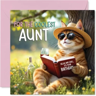 MAKE YOUR AUNT SMILE WITH THIS UNIQUE BIRTHDAY CARD: This exceptional quality Aunt birthday card shows the design 'For the coolest Aunt Relax and chill its your birthday'. If you are looking for an awesome birthday card for Aunt, then then this happy birthday Aunt card is bound to make them smile. Not just a birthday card for Aunt this could also be a birthday gifts for Aunt, Aunty or Auntie. WHAT DO YOU GET: The cards are printed on both sides with the inside print saying 'Have a Great Day' and ample space for your own personal message. The unique fun design is printed on a specially sourced and environmentally responsible board. At 360 microns thick the natural white one-sided gloss board has a quality look and feel. Supplied with a coloured gummed envelope to complement the design and ready to be sealed and sent in the post. NO INK SMUDGES: There is nothing worse than writing inside a card to find that the shiny surface makes the ink smudge. This is why we use a high quality one sided coated board. The uncoated side will absorb more of the ink from your pen to make smudging a thing of the past. Aunt birthday cards, Aunt birthday cards from Nephew. SIZES: Greeting Card = 145mm x 145mm, Envelope = 155mm x 155mm, Card Thickness = 360 micron. Happy birthday Aunt, Aunts birthday card, Aunt cards birthday, birthday card Aunt, happy birthday Aunt card, Aunt gifts from Nephew. MADE AND QUALITY CHECKED IN THE UK: We print and manufacture all our products right here in the UK so you can be sure of a fast turnaround and a product that is expertly made. Using environmentally responsible premium board our card is conscious of the responsible management of the world's forests - happy birthday card Aunt, Aunt birthday cards.