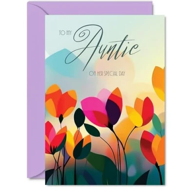 Dazzle your Auntie with joy using our exquisite Happy Birthday Card Auntie; a premium quality masterpiece that features a captivating design saying 'To My Auntie On Her Special Day'. The vibrant colours on this card make it stand out, ensuring it's not just a card but a beautiful keepsake. It's a Personal Gift that shows your Auntie how much you care and the perfect way to express your love and appreciation on her special day. What's Inside: Delve into a world of elegance with the inside print showcasing a lovely verse, 'May you have a fantastic day filled with joy, laughter and all the things...' as seen in the second image. There's ample space for your personal message. Crafted on a 360-micron thick environmentally responsible board, this one-sided gloss board offers a luxurious look and feel. Paired with a colored gummed envelope that complements the design, making it a truly special birthday gesture. Ink Perfection: Say goodbye to ink smudges! Our high-quality one-sided coated board ensures a smooth writing experience without the worry of smudging. The uncoated side absorbs ink, providing a flawless finish that adds to the card's overall premium quality. Auntie birthday cards, ladies birthday card, womens birthday card, Female birthday cards. Dimensions that Impress: Greet with grandeur using a card sized at 148mm x 210mm, accompanied by an envelope measuring 150mm x 212mm. The card boasts a thickness of 360 microns, ensuring a substantial and impressive presence. Auntie birthday card, happy birthday Auntie card, birthday card Female, summer birthday cards for women, birthday card flowers. British Craftsmanship: Proudly crafted and quality-checked in the UK, our birthday cards are a testament to expert design and manufacturing. Utilizing Forest Stewardship Council certified board, we contribute to responsible forest management. Expect a swift turnaround and a product that reflects the highest standards of quality. Auntie birthday cards, Female birthday cards adult, floral birthday card.