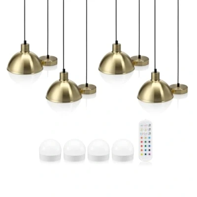 Auraglow Rechargeable Wireless Pendant Light with Remote Cordless, Battery Powered, Dimmable, Colour Changing (Brass, 4 Lamps, Sources, 1 Remote)