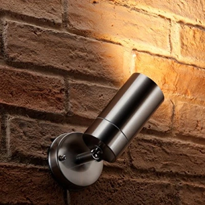 Highly energy efficient solution for lighting garden patio areas and entrances to your home Full pan and tilt rotation which allows you to point the light in any direction you like The tough stainless steel body and glass end diffuser ensure the fitting is able to withstand all weather conditions (IP44 rated) Includes 1 x 5.5w Warm White 3000K LED GU10 Bulb For dimensions please refer to the dimension image shown. Wall fixings included