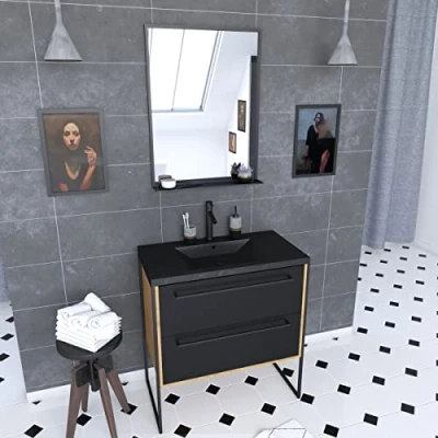 Furniture features: 80 x 50 x 81 cm. MDF and melamine cabinet with brown oak finish. Legs, matt black lacquered aluminium. MDF drawer front: matt black finish. Delivered assembled. Door thickness: 18 mm. Black stone effect finish with overflow. Tap not included. 80 x 50 cm. Basin thickness: 4.1 cm. cm. Features: Mirror: Matt black lacquered aluminium frame with shelf 80 x 60 x 10 cm. Reference: PACM095. Product description: STRUCTURA F086, Manufacturer: Aurlane