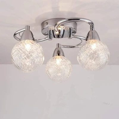 3 lights LED polished chrome finish, spherical/globe glass shade, 12 watts, Warm White (3000K) 3x4W free LED G9 bulbs included, can provide up to 75W incandescent equivalent, save up to 90% energy and has 30, 000 hours of life Overall Size: Diameter: 35cm (13. 8 Inches) x Height: 16. 5cm (6. 5 Inches), Back plate Size: Diameter: 12cm (4. 7 Inches) x Height: 2. 5cm (1 Inch) Ideal for living room, bedroom, kitchen, office, corridor, Hotel, b&b Packaging Includes: 1x3-Light Lighting Fixture, 3xFree 4W G9 LED Bulbs, Installation Guide, Fitting Bracket, 3 Glass Light Shades, 2xScrews, 2xRawl Plugs