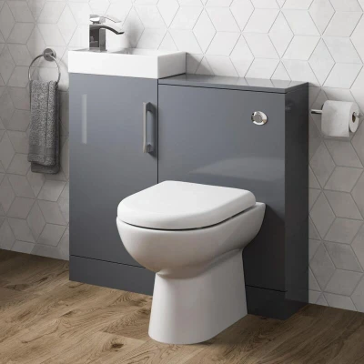 General description Modern Bathroom Toilet & Basin Sink Vanity Unit 900mm in Gloss Grey is the perfect solution for smaller bathrooms, cloakroom suites, or en-suites. This stylish unit combines functionality with a contemporary design, providing ample storage and a sleek appearance. The grey gloss finish not only enhances the aesthetic appeal but also makes cleaning easy. Technical specifications Overall Width: 900mm Overall Height: 880mm Overall Depth: 745mm Toilet Projection: 530mm Toilet Height: 400mm Toilet Width: 370mm Basin Width: 400mm Basin Projection: 220mm Basin Type: Vanity Unit Basin Material: Ceramic Basin Shape: Square Basin Tap Holes: 1 tap hole Colour: Grey Finish: High Gloss Suite Type: Toilet & Vanity Unit Suite Soft Close Seat: Yes Soft Close Doors: Yes Assembly: Easy Flat Pack Installation Type: Floor Standing Handle Style: Straight Long Bar Collection: Artis Compatibility and accessories Includes Basin: Yes Includes Toilet: Yes Tap available when you add to basket