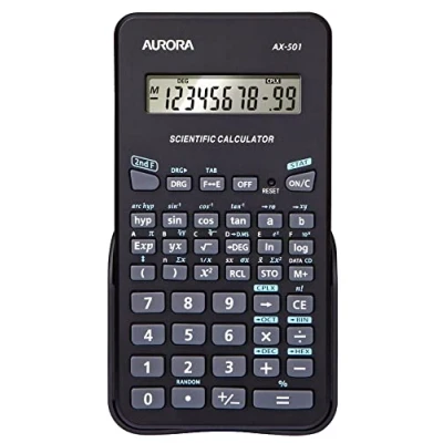 The Aurora AX-501 Scientific Calculator has a single line, 10 digit LCD display.It has 131 functions including -/+ change sign, percentage and memory keys, DEC/HEX/BIN/OCT conversions, degrees, radians and gradians, trigonomics, hyperbolics and statistics data editor.It comes with a slide on protective case and has an auto power off facility. The screw fixed battery cover houses a LR1130 battery (included).