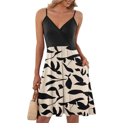 AUSELILY Summer Dresses for Women UK V Neck Spaghetti Strap Casual Dress Beach with Pockets Apricot Black Leaves L