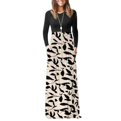 AUSELILY Women's Casual Long Sleeve Maxi Dress Loose Dresses with Pockets Apricot Black Leaves M