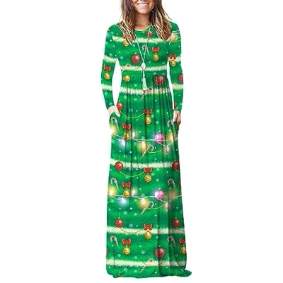 AUSELILY Women's Casual Long Sleeve Maxi Dress Loose Dresses with Pockets Christmas Tree Lights XL