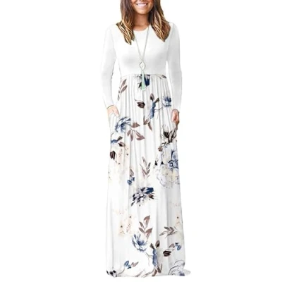 AUSELILY Women's Casual Long Sleeve Maxi Dress Loose Dresses with Pockets White Flowers S