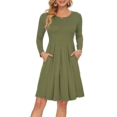 AUSELILY Women's Long Sleeve Pleated Loose Swing Casual Dress with Pockets Knee Length Army Green S