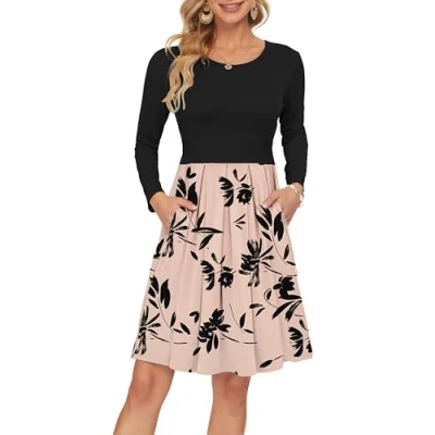 AUSELILY Women's Long Sleeve Pleated Loose Swing Casual Dress with Pockets Knee Length Floral Brown Join Black S