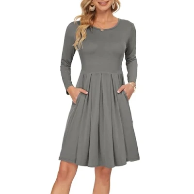 AUSELILY Women's Long Sleeve Pleated Loose Swing Casual Dress with Pockets Knee Length Gray S