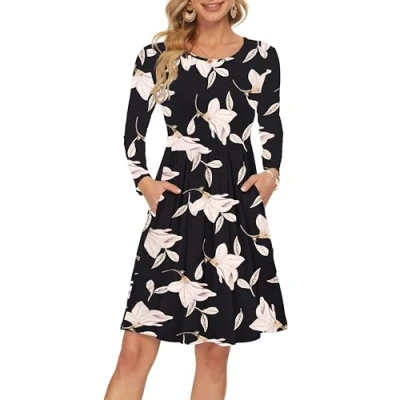 AUSELILY Women's Long Sleeve Pleated Loose Swing Casual Dress with Pockets Knee Length Morning Glory XXL