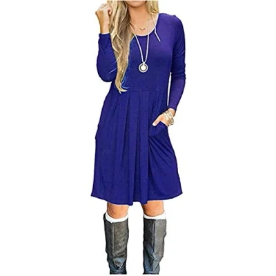 AUSELILY Women's Long Sleeve Pleated Loose Swing Casual Dress with Pockets Knee Length Royal Blue XL