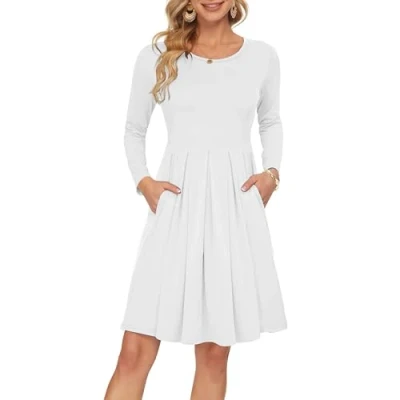 AUSELILY Women's Long Sleeve Pleated Loose Swing Casual Dress with Pockets Knee Length White S