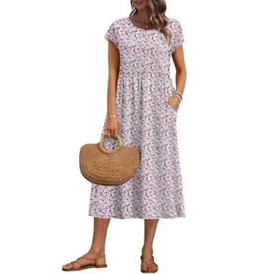 Fabric Composition: made from 90% polyester and 10% spandex, this summer dress for woman offers exceptional stretch that moves with your body while retaining its shape; it’s wrinkle-resistant, and easy to care for Comfortable Fit: This summer midi dress features a loose high-waist design. The high-waisted design effectively flatters the figure. The slightly loose fit ensures comfort and allows for easy movement, making it perfect for all body types Design Features: Features a relaxed crew neck, short sleeves, and a slightly loose empire waist that not only creates a flowing A-line silhouette but also effectively hide the tummy; side pockets add practicality, perfect for keeping small essentials Flattering Midi Length: This summer short sleeve dress hits at mid-calf that balances coverage and movement, which is elegant but offers ease of walking, and works well Multi-Occasion: Ideal for everyday casual outings, summer picnics, beach vacation, afternoon tea, church services and more; its lightweight, breathable fabric keeps you comfortable in warm weather while maintaining an elegant vibe, good for spring and summer