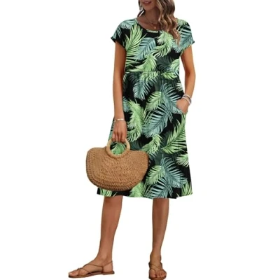 AUSELILY Women's Summer Short Sleeve Knee Length Dresses Round Neck Loose Dress with Pockets Black Green Leaves S