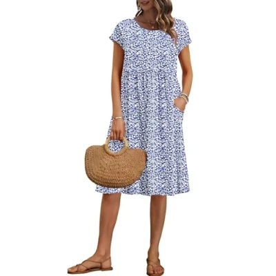 AUSELILY Women's Summer Short Sleeve Knee Length Dresses Round Neck Loose Dress with Pockets Blue Flower S