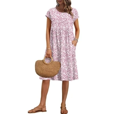 AUSELILY Women's Summer Short Sleeve Knee Length Dresses Round Neck Loose Dress with Pockets Pink Tiny Flowers M