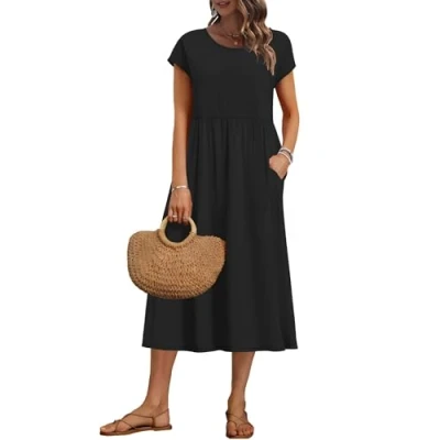 Fabric Composition: made from 90% polyester and 10% spandex, this summer dress for woman offers exceptional stretch that moves with your body while retaining its shape; it’s wrinkle-resistant, and easy to care for Comfortable Fit: This summer midi dress features a loose high-waist design. The high-waisted design effectively flatters the figure. The slightly loose fit ensures comfort and allows for easy movement, making it perfect for all body types Design Features: Features a relaxed crew neck, short sleeves, and a slightly loose empire waist that not only creates a flowing A-line silhouette but also effectively hide the tummy; side pockets add practicality, perfect for keeping small essentials Flattering Midi Length: This summer short sleeve dress hits at mid-calf that balances coverage and movement, which is elegant but offers ease of walking, and works well Multi-Occasion: Ideal for everyday casual outings, summer picnics, beach vacation, afternoon tea, church services and more; its lightweight, breathable fabric keeps you comfortable in warm weather while maintaining an elegant vibe, good for spring and summer