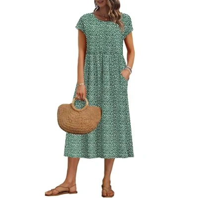 Fabric Composition: made from 90% polyester and 10% spandex, this summer dress for woman offers exceptional stretch that moves with your body while retaining its shape; it’s wrinkle-resistant, and easy to care for Comfortable Fit: This summer midi dress features a loose high-waist design. The high-waisted design effectively flatters the figure. The slightly loose fit ensures comfort and allows for easy movement, making it perfect for all body types Design Features: Features a relaxed crew neck, short sleeves, and a slightly loose empire waist that not only creates a flowing A-line silhouette but also effectively hide the tummy; side pockets add practicality, perfect for keeping small essentials Flattering Midi Length: This summer short sleeve dress hits at mid-calf that balances coverage and movement, which is elegant but offers ease of walking, and works well Multi-Occasion: Ideal for everyday casual outings, summer picnics, beach vacation, afternoon tea, church services and more; its lightweight, breathable fabric keeps you comfortable in warm weather while maintaining an elegant vibe, good for spring and summer