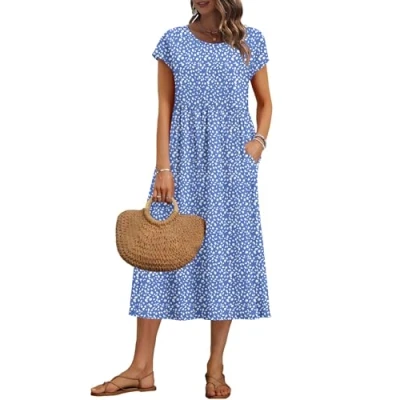Fabric Composition: made from 90% polyester and 10% spandex, this summer dress for woman offers exceptional stretch that moves with your body while retaining its shape; it’s wrinkle-resistant, and easy to care for Comfortable Fit: This summer midi dress features a loose high-waist design. The high-waisted design effectively flatters the figure. The slightly loose fit ensures comfort and allows for easy movement, making it perfect for all body types Design Features: Features a relaxed crew neck, short sleeves, and a slightly loose empire waist that not only creates a flowing A-line silhouette but also effectively hide the tummy; side pockets add practicality, perfect for keeping small essentials Flattering Midi Length: This summer short sleeve dress hits at mid-calf that balances coverage and movement, which is elegant but offers ease of walking, and works well Multi-Occasion: Ideal for everyday casual outings, summer picnics, beach vacation, afternoon tea, church services and more; its lightweight, breathable fabric keeps you comfortable in warm weather while maintaining an elegant vibe, good for spring and summer