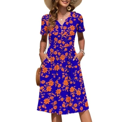 AUSELILY Women's Summer Short Sleeve Midi Dresses V Neck Empire Button Knee Length Dress with Pockets Blue Orange Flower XXL