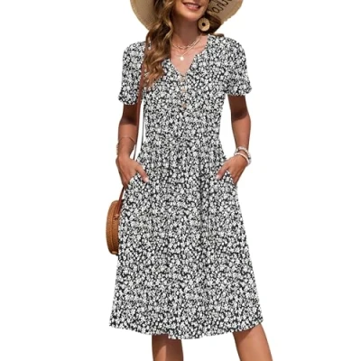 AUSELILY Women's Summer Short Sleeve Midi Dresses V Neck Empire Button Knee Length Dress with Pockets Floral Black White S