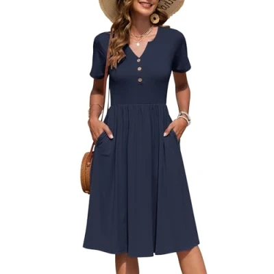 AUSELILY Women's Summer Short Sleeve Midi Dresses V Neck Empire Button Knee Length Dress with Pockets Navy Blue S