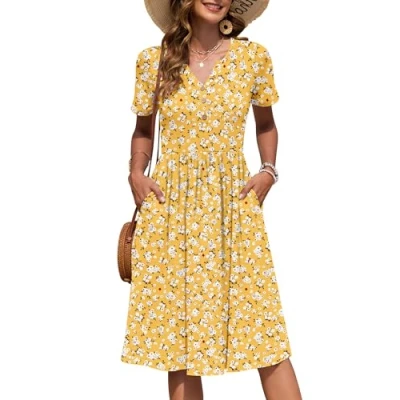 AUSELILY Women's Summer Short Sleeve Midi Dresses V Neck Empire Button Knee Length Dress with Pockets Yellow Florals XL