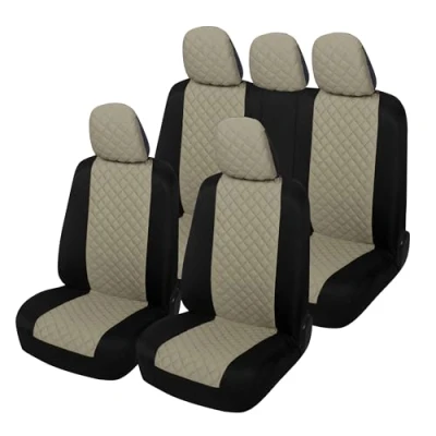 Complete set of universal seat covers, made of 140g quilted polyester with stretch fabric in the back of the covers. The rear seat covers consist of 2 zips on the backrest which allow them to be fitted in almost all versions of rear seats (40/60 - 60/40 - full) Where can I mount it? Recommended for cars with standard seats (no SUV and off-road). Suitable for use with fixed headrests and removable headrests. Not suitable for cars with sports seats and/or continuous upholstery Universal product developed for a large number of cars, it is not possible to guarantee an optimal fitting accuracy for each individual car. Compatible for Alfa Romeo Audi Dacia Fiat Ford Honda Hyundai Mazda Mitsubishi Nissan Opel Peugeot Renault Seat Skoda and many more 9-piece set consists of 2 front seat covers (driver side + passenger side), 2 rear (backrest + seat), 5 headrest covers. Includes mounting hooks Useful for not staining and/or damaging your car seats and to customize the interior of your car, improving the appearance of your car. Please try to avoid violence during assembly, as the rubber bands may tear if the tension is too high
