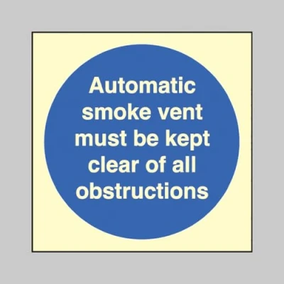 Automatic smoke vent must be kept clear of all obstructions (glow in the dark self adhesive vinyl sign) size: 200x200mm (Caledonia Signs SKU: 41425F)
