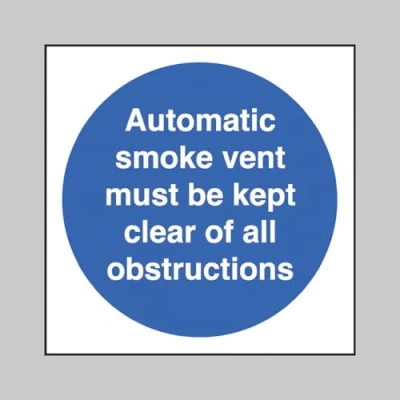 Automatic smoke vent must be kept clear of all obstructions (semi rigid pvc sign) size: 200x200mm (Caledonia Signs SKU: 11425F)