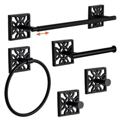 Complete & Stylish Bathroom Hardware Set - This comprehensive 5-piece hardware collection includes a 17-inch towel bar, toilet paper holder, hand towel rack, hand towel ring, and two multi-purpose hooks, ensuring an organized and stylish bathroom setup without sacrificing sleek design and functionality Matte Black Bathroom Accessories - Elevate decor with a sophisticated towel rack and toilet paper holder set. Its scratch-resistant surface ensures sturdy construction without sharp edges, perfect for hanging various items, enhancing your bathroom's aesthetic Premium & Durable - Crafted from durable materials to prevent rust, corrosion, ensuring long-lasting performance. Elevate your bathroom's style with this versatile set, featuring a towel and toilet paper holder, ensuring exceptional quality for extended use Wall-Mounted Towel Rack Set - Maximize space, maintain bathroom tidiness, and elevate allure with this sleek set. It includes a towel rack and essential components for functionality and an organized space. With installation instructions and provided hardware, upgrade your bathroom effortlessly Versatile Usage - Crafted with clean lines and concealed mounting holes, our 5-piece bathroom hardware set in elegant black matte enhances various spaces like bathrooms, outdoor showers, remodeled bathroom closets, kitchen cabinets, laundry rooms, sitting rooms, and more. Its aesthetically pleasing design and adaptability make it a perfect addition to create an organized and sophisticated atmosphere throughout your home, Weight: 2.8990787453 pounds, Manufacturer: One World Décor