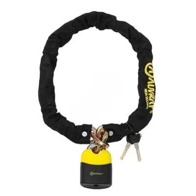 Chaine pour moto, scooter et vélo en acier cémenté de 10 mm Longueur 120 cm Livrée avec cadenas 65 x 90 mm Livrée avec 2 clés Une protection en tissu recouvre la chaîne pour ne pas rayer votre véhicule lors du transport et de l'utilisation.