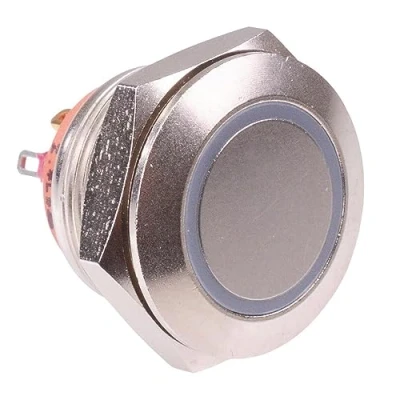 The AV9SLD2086002 is a red illuminated 19mm momentary anti vandal push button switch featuring SPST contacts and solder terminals. The switch features a chrome plated body and is suitable for a wide range of applications. Red 2V LED, Switch Rating: 50mA 24VDC Off-(On) momentary function Panel cut-out: 19.2mm