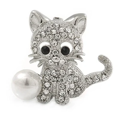 Avalaya Clear Crystal Little Kitten with Pearl Bead Brooch in Silver Tone Metal 30mm L