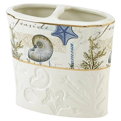 INCLUDES: (1) Toothbrush Holder MATERIAL: 100% Ceramic EASY-CARE: The heavyweight ceramic can be wiped with a damp microfiber for best results. DETAIL: Wrapped with a beautifully detailed seascape, the Antigua Collection Toothbrush Holder has a gold border on the top and bottom, and is embossed with sea creatures. ANYWHERE: Add style to any room in your home