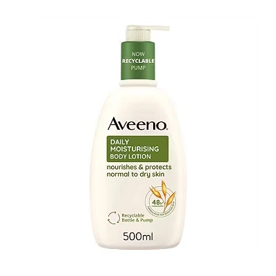 Formulated with Prebiotic Colloidal Oat - Aveeno Daily Moisturising Body Lotion is formulated with naturally derived prebiotic colloidal oatmeal; it preserves the skin's natural microbiome for healthy looking and more resilient skin from the first use; in vitro test Skin Condition Improvement - This nourishing lotion for men and women helps to improve the appearance of dry skin from day 1; the Aveeno body moisturiser lotion helps restore the skin's natural barrier function, significantly improving the condition of dry skin in just 2 weeks Fast Absorbing - This fast absorbing lotion leaves skin feeling soft, smooth and healthy looking; it is also unscented and non-greasy Suitable for Sensitive Skin - The body lotion actively moisturises dry, sensitive skin and is gentle enough for everyday use New larger 500ml pack size