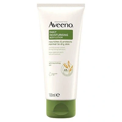 Aveeno Daily Moisturising Body Lotion, fragrance-free and 100ml, nourishes normal to dry skin with oat extract and emollients to strengthen the skin barrier and provide up to 48 hours of hydration. It’s non-greasy, fast-absorbing, and ideal for sensitive skin.