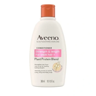 STRENGTH & LENGTH: This Aveeno Hair Strength + Length Conditioner for weak+ hair strengthens hair from root to tip and prevents hair breakage for longer, hydrated, and healthy-looking lengths PREVENTS HAIR BREAKAGE: Formulated with a plant protein blend & colloidal oat, this strengthening conditioner prevents hair breakage for longer, hydrated, and healthy-looking lengths. Strengthens hair from root to tip PLANT PROTEIN BLEND + COLLOIDAL OAT: This sulfate-free pH balanced conditioner is for sensitive skin and weak+ hair, and is formulated with a plant protein blend & colloidal oat CLINICALLY PROVEN TO SOOTHE SCALP: Suitable for sensitive skin, this pH balanced colloidal oat conditioner has sulfate-free surfactants and is clinically proven to soothe a dry, itchy and flaky scalp HOW TO USE: After shampooing, apply conditioner generously to hair, working through to ends. Wait 3-5 minutes. Rinse hair thoroughly.