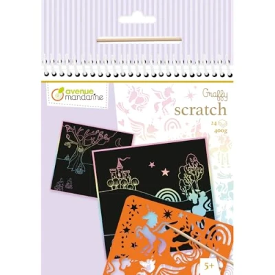 Avenue Mandarine GY161C Un carnet Graffy Scratch de 24 Cartes à gratter pré imprimées + 1 pochoir et Stylet en Bois inclus À partir 5 ans Licorne