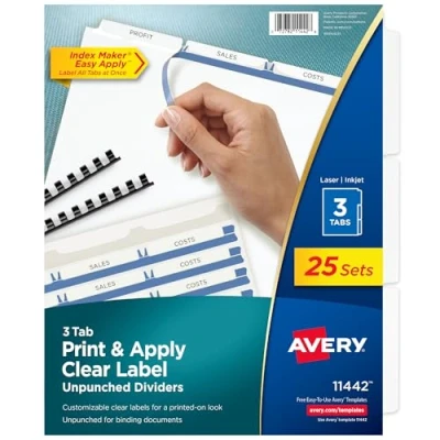 Avery 3 Tab Unpunched Binder Dividers, Easy Print & Apply Clear Label Strip, Index Maker, White Tabs, 25 Sets (11442)