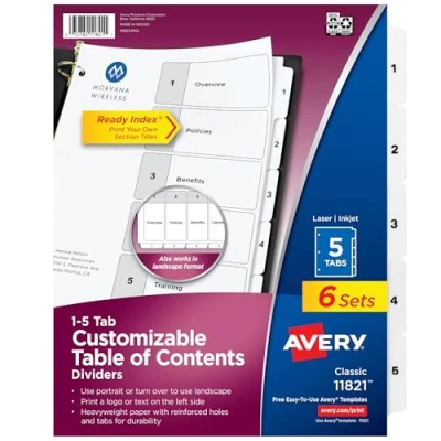 Avery 5 Tab Dividers for 3 Ring Binders, Customizable Table of Contents, Classic White Tabs, 6 Sets (11821)