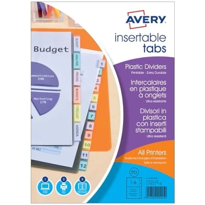 Software Code: L7437-6 Customizable and printable tabs Laser Printing, Inkjet, Copier Customizable online on avery.fr Heavy Duty 180 Micron Polypro