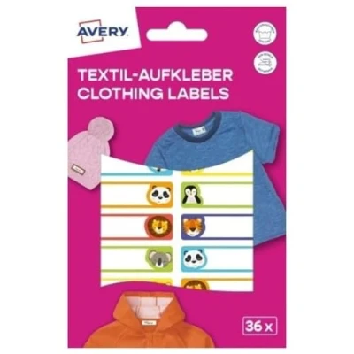 Avery Art. ETVET36A Name Stickers Animals Waterproof for Clothes Pack of 36 (13 x 45 mm, Vinyl Film, Self Adhesive Textile Labels, Writeable Stickers, Washing Machine and Dryer) Colourful