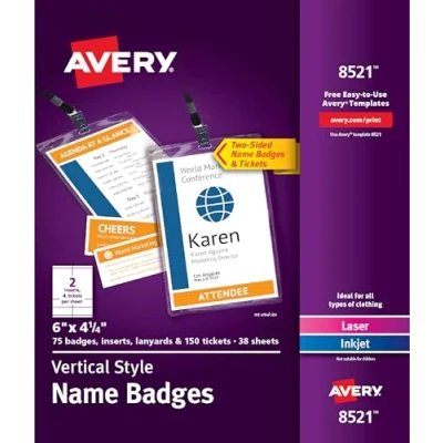 Avery Customizable Name Badges, 6" x 4.25", Printable Tag Inserts with Tickets, 75 Vertical Holders Lanyards (8521)