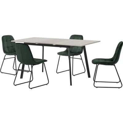 ManoManoGeneral description Avery Extending Dining Set with Lukas Chairs features a modern design that combines functionality and style, making it a perfect addition to any dining area. Technical specifications Material: MDF/metal frame, plastic veneer, velvet fabric, foam, plywood, non-woven Extended Table Dimension: L80 x W160 x H76 cm Folded Table Dimension: L80 x W120 x H76 cm Chair Dimension: L54 x W43 x H81 cm Total Weight: 34 kg