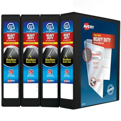 Designed to be stronger and more durable than basic binders, these 4 black heavy-duty binders feature a tear-resistant spine (DuraHinge) and more flexible, split-resistant edges (DuraEdge) Slant ring holds 40-50% more paper than basic 1.5 inch binder; 400-sheet capacity Secure but easy to open; One Touch slant rings are back mounted, gap free and release at the touch of a button Extra storage with 4 interior clear pockets; all Heavy Duty binders are made with nonstick PVC-free material—no ink transfer Heavy Duty view binder allows for customization on spine, front and back covers